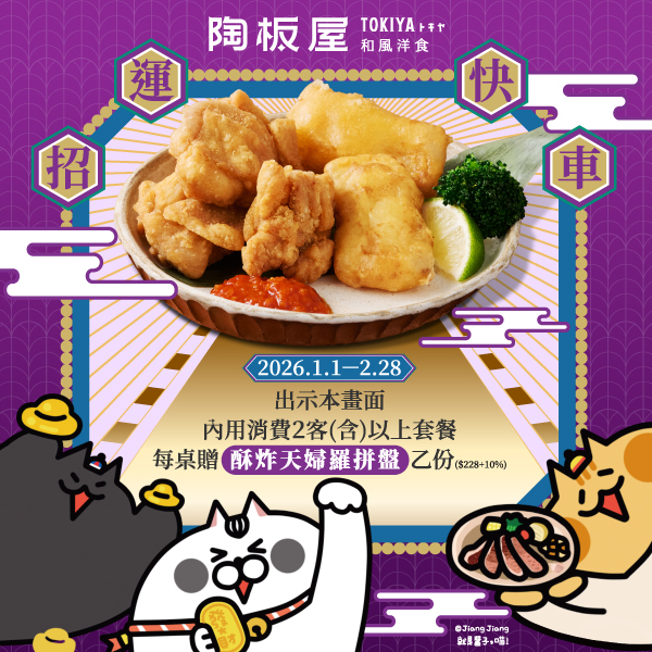 出示本畫面,內用消費2客(含)以上套餐,每桌贈【酥炸天婦羅拼盤】乙份(價值$228+10%)