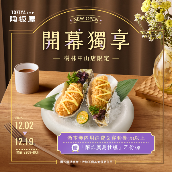 ■ 開幕限定:2025/12/2-12/19出示本畫面,內用消費2客(含)以上套餐,贈酥炸廣島牡蠣乙份/桌(價值$208+10%)